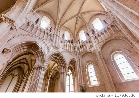 Romanesque arches and columns supporting the ceiling of Poitiers Cathedral in France