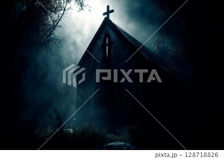 Night shrouded antique church with cross surrounded by thick fog creates an eerie atmosphere
