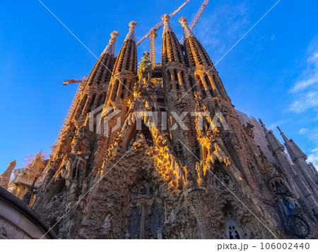夜明けの朝日を浴びるサグラダ・ファミリア
