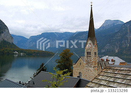 ハルシュタット湖に浮かんで見える聖母被昇天教会