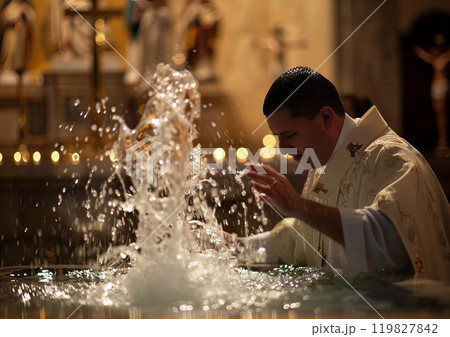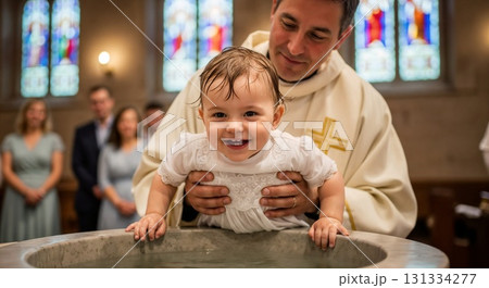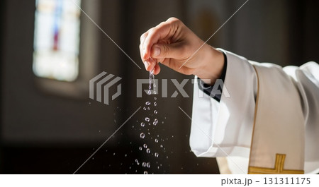 Priest Performs Baptism Ritual With Water in a Serene Church Setting During a Religious Ceremony