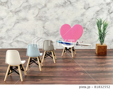椅子に乗せた注射器とハートと並んだ椅子_茶色木板背景