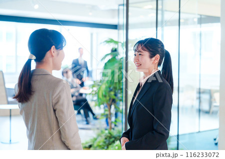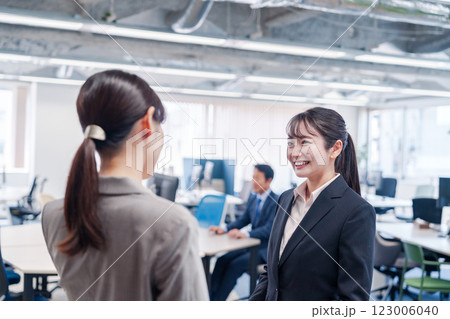 先輩社員にオフィスを案内してもらうフレッシュな女性