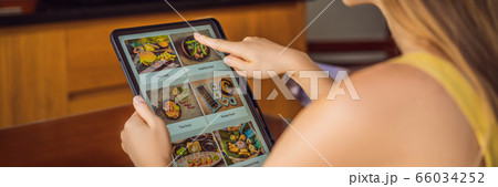 Young woman orders food for lunch online using Tablet BANNER, LONG FORMAT