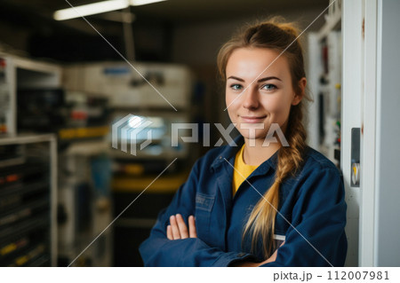 Skilled confident female electrician in workshop. Young smiling woman electrical worker in work room. Innovation and precision in action, expertise and confidence as key to progress in modern setting
