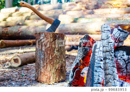 Cartoon lumberjack with beard and helmet holding an axe. Male in plaid shirt and jeans, forest background vector illustration