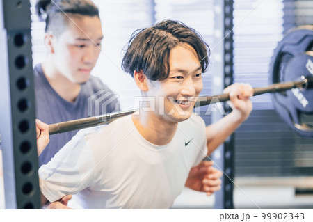 重たい大きな荷物を運ぶ笑顔の男性 全身 作業着