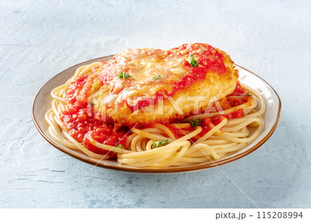 Chicken Parmesan, Italian pasta dish. Breaded chicken breast with cheese