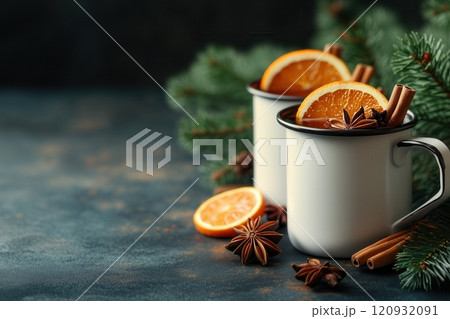 Mulled wine in white metal mugs with cinnamon and orange slice on festive background. Copy space for text