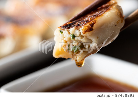 タレにつけて食べる美味しそうな焼き餃子のクローズアップ