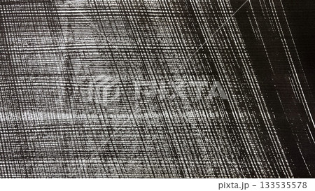 墨で描いた細かい格子模様の絵、墨の筆跡がある掠れたチェックの模様線、モノクロ バナーサイズ