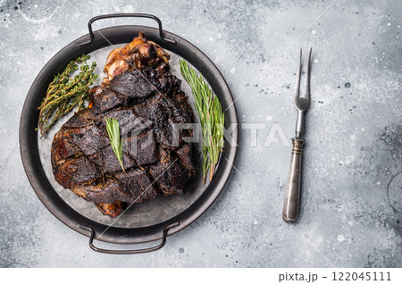 Slow cooked venison roast leg. Braised game meat of deer with bone. grey background. top view