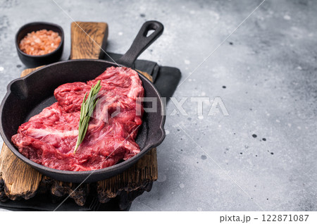 Ready for grilling Raw hanging tender or Hanger beef steak in a pan. grey background. top view