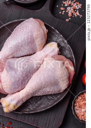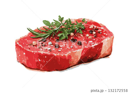 Raw beef steak topped with fresh herbs and colorful spices in painted style on white background, concept of gourmet cooking