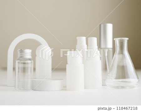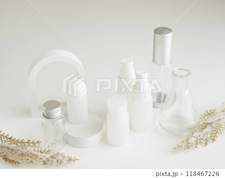 ボタニカルなイメージの白い化粧品ボトルと植物
