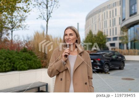 A woman stands confidently on a sunny city street, showcasing a cheerful smile Generative AI