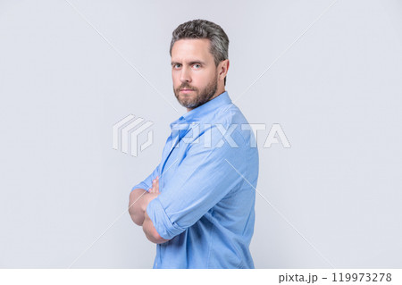 photo of confident bearded man with beard. bearded man with beard wearing casual shirt.