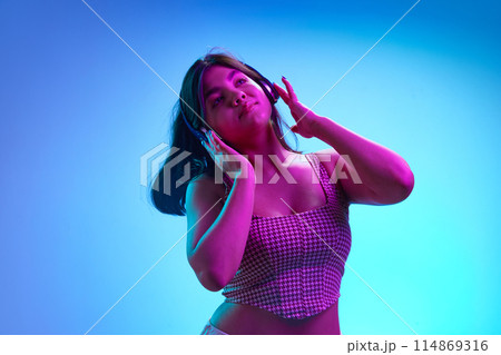 Active brunette woman dancing while listening music in headphones in pink neon light against gradient blue background.
