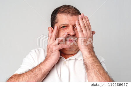 Young caucasian female with natural makeup posing on neutral background, eyes