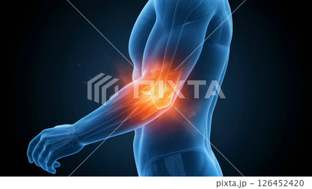 男性の、肘の痛みや筋肉の緊張を表現した医学的イラスト。人体の筋肉構造を示し、炎症や負傷を強調