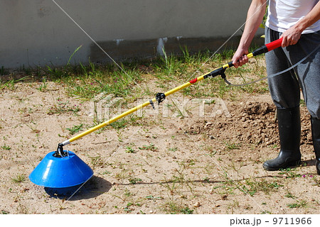 バケツを持って家庭菜園に肥料をまくシニア男性