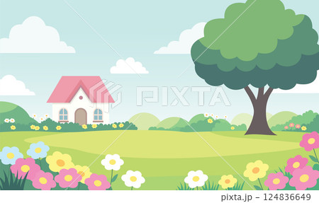 Beautiful Home House Building with Colorful Flowers Floral Garden Park Yard Landscape in Summer