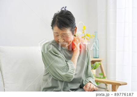 肩凝りのシニア女性の後ろ姿 リビングルーム