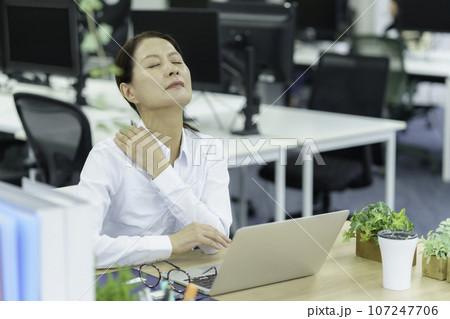 オフィスで肩を抑えるミドルエイジの女性 肩凝り