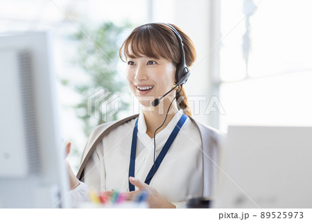 パソコンの前でヘッドセットをつけて通話をしているビジネスウーマン
