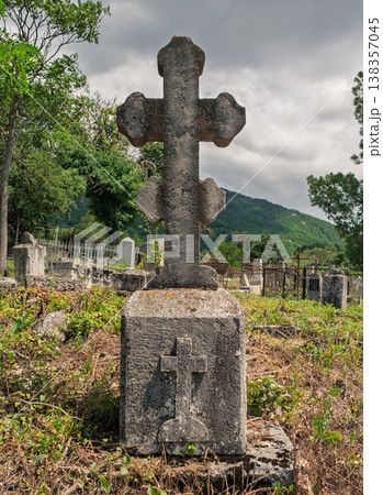 Ancient stone cross monument rises above overgrown grass in a quiet rural cemetery on a cloudy afternoon