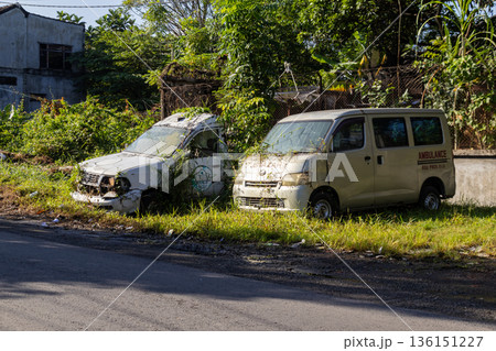 Abandoned vans overgrown with vegetation parked on roadside for decay and environmental reclamation concept