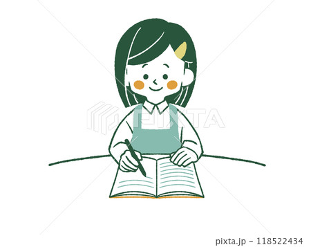 ノートに記入しているエプロンを着用した女性-4色