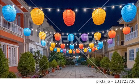 Colorful traditional lanterns adorning a festive street in India during Independence Day celebrations at night