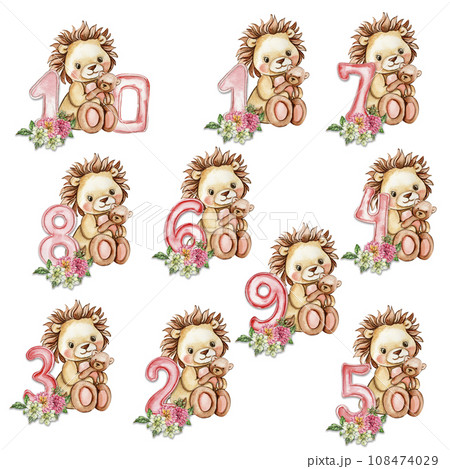 Watercolor hand drawn small baby lion with dahlia flowers and numbers composition. African baby animal for baby shower party design, birthday, cake, kids room decorations, poster, fabric.