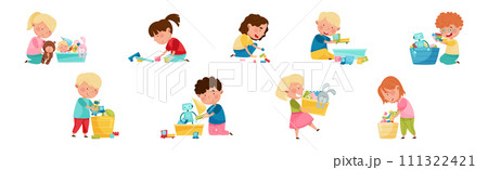 Funny Kids Playing with Different Toys in Playroom Vector Set