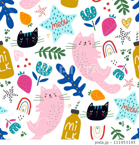 Seamless modern childish pattern with cartoon pink cats. High detailed kids texture with star, cat, rainbow, strawberry, heart, milk. Vector illustration