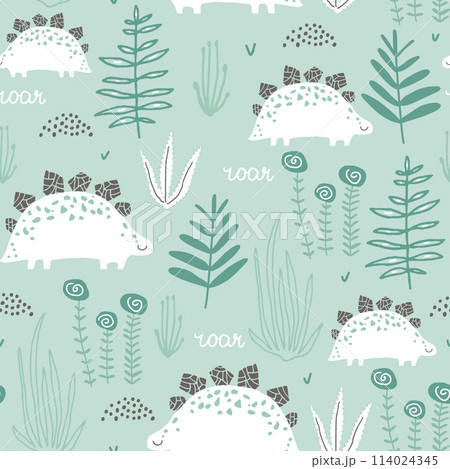 Childish seamless pattern with stegosaurus and jungle flora. Creative vector childish background for fabric, textile