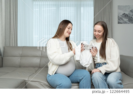 Two young woman friends choosing baby clothes while sitting on a couch, pregnant woman is holding baby onesie. Concept of motherhood, friendship, preparation, excitement, and bonding.