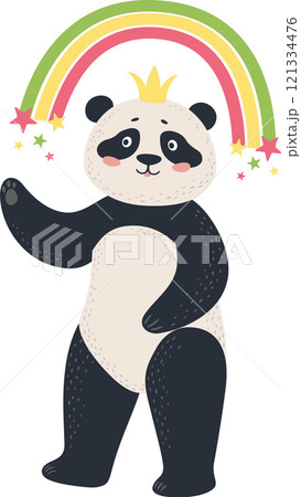 Adorable panda bear wearing golden crown waving paw standing under colorful rainbow with shining stars, cartoon vector illustration isolated on white background