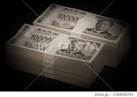 斜めのアングルで撮影した日本の新紙幣。1000万円の束のネガティブなイメージ