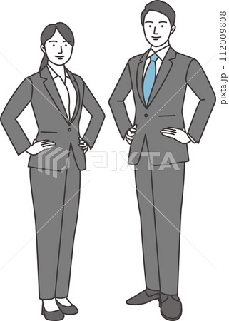 ビジネススーツ姿の男女が笑顔で腰に手を当てて正面を向いているイラスト