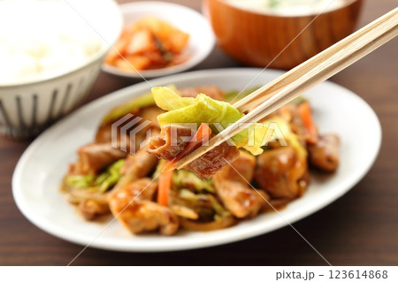 ホルモン炒め定食を箸で食べる 背景ぼかし