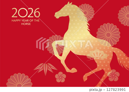 干支の馬と正月モチーフの年賀状イラスト(赤×金)