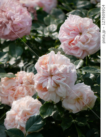 Blooming roses in Rosengarten Volksgarten in Vienna. Varietal elite Floribunda Rosa Damascena flowers