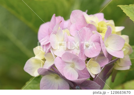 淡いピンク色のかわいい紫陽花の花 グリーン背景