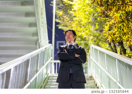 夜の階段で腕を組むスーツの男性、自信に満ちた表情のビジネスマン