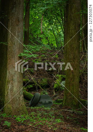 森に不法投棄されたタイヤとブラウン管テレビ・環境問題を訴える一枚