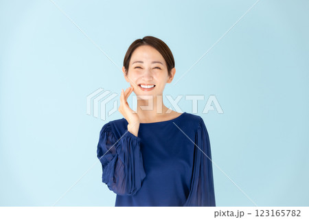 Skincare, woman and cosmetics for wellness, smile and treatment against a blue studio background. Portrait, makeup and Latino girl with natural beauty, clear and smooth for organic facial and relax.