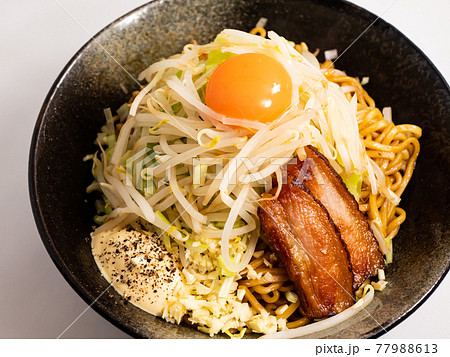 白背景の二郎系まぜそばのアップ