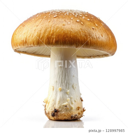 A striking closeup of a single, large mushroom against a pure white background. Its cap displays rich, earthy tones of brown and orange, while the stem showcases a creamy, textured surface.